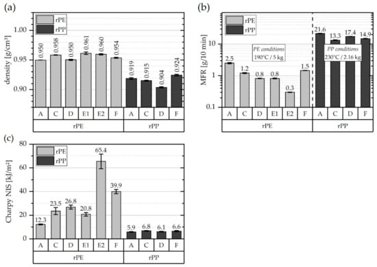 Graphical illustration of (a) density values, (b) melt flow rate (MFR) values, and (c) Charpy notched impact strength (NIS) values of all investigated rPE and rPP materials, respectively.