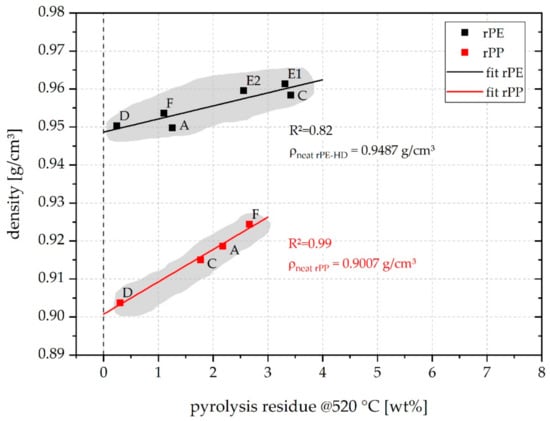 The linear regression applied to the rPP data yielded an R2 of 0.99. The neat rPP density obtained by extrapolation to zero pyrolysis residue was derived as 0.9007 g/cm3. This is in very good agreement with the typically expected density of virgin PP []. Interestingly, the slope of the rPP density fit function is much steeper than that of the rPE data. This is likely due to the fact that the rPP materials contain some PE-HD as shown in Section 3.1. In rPP, this polyolefin cross-contamination by PE-HD tends to further increase the overall density of the recyclate on top of the effect of inorganics fillers, while the opposite is the case for rPE-HD contaminated by PP, because PP has a lower density than PE-HD.