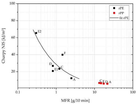 In practice, there is an entire array of parameters ranging from molecular architecture to morphology and presence of rigid or elastomeric phases that can have a pronounced influence on the impact strength of polyolefins. A particularly fundamental structure–property relationship exists between toughness and the mean molecular mass (or the molecular mass distribution as a whole) [,]. The latter is inversely related to MFR. The respective data of Charpy NIS and MFR of all investigated rPE and rPP grades is plotted in a log-linear representation in Figure 10. Indeed, an inverse correlation can be observed, whereas the rPE data are significantly more scattered than the rPP data. To some extent, this can be explained by the fact that the rPE data cover a much wider range of Charpy NIS values, from 12 to 65 kJ/m2, while the four rPP grades show essentially the same impact strength of roughly 6 to 7 kJ/m2. In addition, the rPE materials are more diverse in terms molecular structure as demonstrated by the wide split of their MFR values in a logarithmic representation.