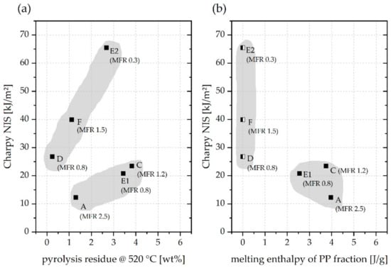 Drawing specific attention to the impact performance of the rPE materials, it seems reasonable to consider compositional aspects of these materials on top of the influence of MFR. A plot of Charpy NIS versus pyrolysis residue at 520 °C is depicted in Figure 11a. There seems to be no detrimental effect of a certain level of inorganics content. As a matter of facts, those grades of rPE with more pyrolysis residue even achieved higher Charpy NIS values. It is true that mineral fillers, especially calcium carbonate, can significantly enhance impact toughness []. However, a strong toughening effect is usually observed either at (much) higher mineral loading levels than determined in the present work [,] or when a very fine nanocomposite-like dispersion is achieved []. Regardless of that, neither MFR (Figure 10) nor the level of inorganics (Figure 11b) seem to sufficiently explain the apparent clustering of rPE-A, C, and E1 on the one hand and rPE-D, E2, and F on the other hand, as illustrated by the grey areas.
