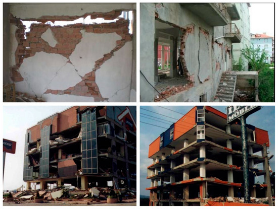 While having many advantages, masonries have major drawbacks in some certain cases. These walls consist of multiple different units, such as bricks and mortar, which are thus prone to exhibit complex behavior under particular dynamic loads, e.g., earthquakes. The elements are very often created by the materials that have limited deformation capacities and cannot therefore satisfy the high displacement requirements for such forces. In particular, when the masonries are utilized as infill walls in the reinforced concrete (RC) buildings, interaction effects emerge between the frames and walls, which potentially cause damage to both these members due to the lack of ductility around the boundary zones, as well as the intrinsic material characteristics [1,2,3]. As a result of cyclic continuous loads, slight damages become visible and expand through the walls and RC frames, which eventually lead to either local or total structural instabilities. Past earthquakes show us the infill wall related damages in Figure 1 [4,5]. Various crack and fracture scenarios are seen in the real-life examples of the damaged masonry walls. However, it is still possible to categorize these in two main groups: in-plane and out-of-plane damages. For the in-plane failures, dominant forces occur inside of the wall plane and damages take place when the stress carrying capacity of the wall members is exceeded. Diagonal cracks or corner crushes are typical examples of this type of failure. In the case of the wall units comprised of relatively stiff materials, such as strong bricks, it is known that RC frames could also become damaged. Besides, out-of-plane failures indicate disturbance in the direction perpendicular to the wall plane. It is mainly observed when the seismic excitations cause damages to the weak connections between RC frames and infill walls. It is also possible that both types of failures could be effective progressively or simultaneously on the same wall. This is a matter of loading and construction features.