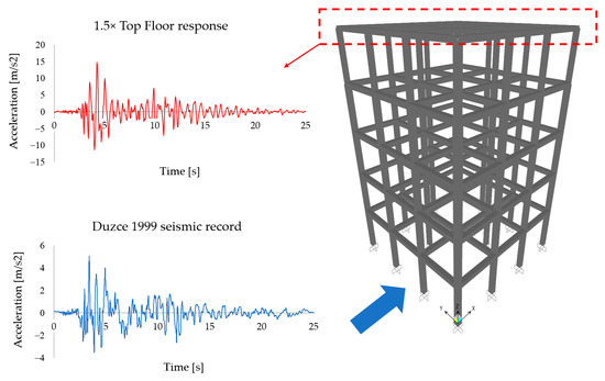In order to establish a realistic seismic loading for the planned detailed analyses, a multi-storey building was first created numerically in the structural analysis program SAP2000 [40]. The hypothetical building consists of five storys and was assumed to have fixed supports on the ground. All beam and column members were modeled by one-dimensional bar elements. Nonlinear behavior of the frame building was provided by means of assigning plastic hinges at both ends of the beams and columns. The seismic acceleration data was taken from the literature (Duzce, 1999 earthquake, Figure 2). The loading was implemented on the ground level and in one direction only, since the building was modeled symmetrically. After evaluating the results, it was decided to take the acceleration response of the top-level storey for further analyses. It is due to the fact that top levels naturally have the highest acceleration outcomes and are therefore exposed to earthquake effects more severely. Moreover, preliminary Phase II analyses indicated that even the top-storey results could not exhibit the worst scenarios, hence the top-storey acceleration response was increased by multiplying the data by a factor of 1.5. This new acceleration data was used in the next phase of analyses, see Figure 2.