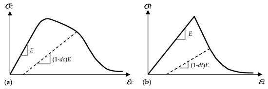 Concrete is considered to be a quasi-brittle material and it tends to behave elastically in a limited range of deformability. Its strength and durability capacity highly depends on the proportional mix of multiple components namely, cement, aggregate and water. Despite its heterogenous nature, in practice, it is a common approach to model the concrete with isotropic material properties, since the reliable results can still be achieved. However, compression and tension features are substantially different and thus need to be determined separately. Abaqus [41] offers multiple solutions in terms of modeling the concrete like materials. One of the popular ones is named the Concrete Damaged Plasticity (CDP) technique that is also preferred for this study. The results of some previous researches constitute the basis of this method [42,43,44]. It is suitable for monotonic, cyclic and dynamic loads. The continuum, plasticity-based damage model is followed and it enables us to model failure mechanisms for tensile cracking and compressive crushing of concrete. It is capable of providing solutions to simulate hysteretic behavior of concrete under reversal loads such as earthquakes [45], besides that different material compositions e.g., Steel or Glass Fibres are feasible to be defined in the concrete matrix with this method [46,47]. Post-damage behavior is also possible to be described using the stiffness degradation approach by means of modifying the initial elasticity modulus with a damage factor. In order to determine the damage parameters, a solution suggested by Birtel and Mark [48] was followed. In this reference, the authors declare two damage factors, dc and dt, for compressive and tensile components, respectively. Plastic strain: εpl, stress: σ, Young’s modulus: E and a constant value: b (0 < b < 1) are given as the required parameters, while determining the damage factors. In their research, a shear test on an RC beam was numerically simulated and the verification was made with the experimental results. The constant value of b for compressive and tensile loading paths were determined as bc: 0.7 and bt: 0.1, respectively. By default, this assumption was utilized in the current paper. Equation (1) shows the details of this formulation. In Figure 4, the damage evolution concept is briefly represented for compressive and tensile loading.