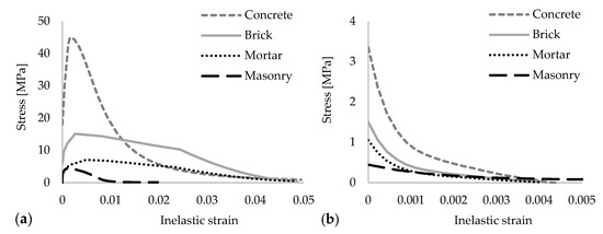 Since bricks and mortars also have similar quasi-brittle material characteristics as concrete, the CDP modeling technique was adopted for these as well. Experimental research outcomes of Kaushik et al. [51] were utilized as the basis of material properties definition. The material models were numerically tested and were later given in this study, while modeling the small size tests by Viskovic et al. [52]. Stress-strain curves and the input parameters are presented in Figure 5 and Table 1, respectively.