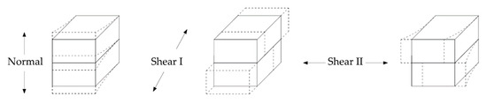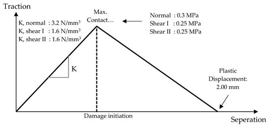 In the micro model technique, in addition to the independent material properties, the interaction between those also need to be defined, such as brick-to-mortar or concrete-to-mortar interfaces. Of the noble solutions, that provided by Abaqus [41] was preferred in order to overcome this challenge, in which cohesive surfaces enable us to simulate compressive, tensile as well as the shear behavior of the interaction zones. This method is particularly suitable when the traction-separation kind of damage is expected on thin layer surfaces. It is capable of creating the damage models on three different directions, one to the interface normal and the other two parallel to it, as shown in Figure 6. The model requires the input of stiffness values of contact and the corresponding damage initiation-evolution parameters by means of evaluating the stress, displacement or energy values. It assumes a linear behavior until reaching the ultimate load capacity and afterwards either linear or exponential damage evolution is possible to be defined. For this study, a linear branch of damage propagation was assumed, as given in Figure 7.