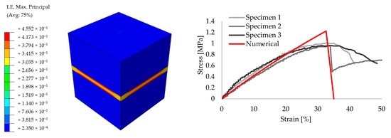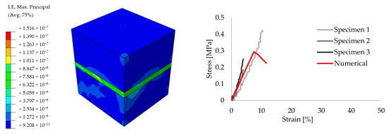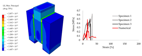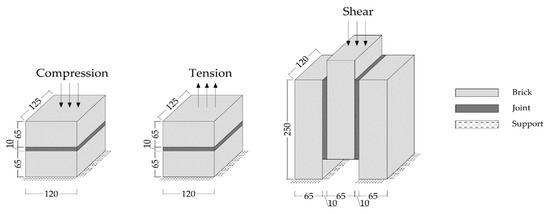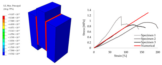In order to achieve reliable results for the further analyses, preliminary small size specimens were modeled by means of creating different masonry configurations. For this purpose, experimental results from the literature are taken [52]. The small size specimens were configured by solid clay bricks with the dimensions of 65 mm × 120 mm × 250 mm and joints with 10 mm thickness. Joints were utilized by traditional mortar with the compressive strength of fm = 7.2 N/mm2 for the stiff bonding, whereas PolyUrethane PM was chosen for providing the flexible joints. Compression, tension and shear test configurations are presented in Figure 9. The results of the experiments are compared to the numerical models. Figure 10, Figure 11, Figure 12, Figure 13, Figure 14 and Figure 15 show the final steps of analyses, together with the stress-strain curves. In the original study [52], stress values were obtained by means of dividing the applied force to the net surface area of the joints. For the compression and tension tests, this area is equal to the surface perpendicular to the loading (120 mm× 125 mm), whereas for the shear tests, the area was determined from the joints laying parallel to the shear force (2 mm × 120 mm × 200 mm), see Figure 9. However, the strain values were calculated using the joint thickness. Accordingly, shortening and elongation of the joint thickness was a matter of strains for the compressive and tensile tests, respectively. Similarly, the joint deflection was the source of strain measurement for the shear tests. It was obtained by finding the ratio between the tangential vertical displacement of joints and the length of the net bonding zone parallel to the loading.