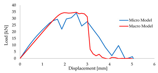 As a next step, a previously adapted micro-model approach was compared to the macro-model technique in which bricks units, mortars and their interfaces were modeled as a single element, which reflects the isotropic mechanical features. This method is later followed, while creating the wall models for large size analyses. Such a simplification was essential, since the detailed micro models are not very feasible for the large size analyses due to the high computational requirements. Suggestions from Kaushik et al. [51] and Eurocode-6 [58] were taken into account when determining the macro model parameters, although Young’s modulus was modified differently than the aforementioned references, since the preliminary analyses gave much higher stiffness values for those. In several trials, the Young’s Modulus value of E = 1000 MPa was found to be a close match for this specific study. Wallet models were created accordingly and tested diagonally through their in-plane directions. The models were configured to utilize 65 mm wall thickness as similar to the large size specimens. Material properties and the stress-strain curves of the masonry element are given in Table 1 and Figure 5, respectively.