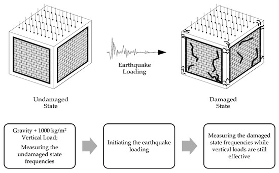 In accordance with the ultimate purpose of this study, real-size cubic shaped RC in filled frames were numerically created. Data from the previously mentioned calibration tests were taken into account when modeling the large structures. All building types—BF, TM, and PUFJ—were assumed to have fixed supports to the ground at the bottom level. However, translational freedom in the earthquake loading direction was enabled in order to actualize seismic acceleration. Both material and geometrical nonlinearity (second order effects) were enabled in the analyses. The same loading procedure was followed for all the three frame types. At first, the frames were forced with the gravity loads induced by the mass of the systems and the additional vertical load on the top slab level. Once the loading step was complete, the natural frequencies of structures were measured. Following that, the earthquake loading was initiated by means of imposing the acceleration response given in Figure 2 on the ground level and in a similar approach to the last step, the modal frequency results were checked at the end of the analyses. This approach is represented by a flowchart given in Figure 18. In the next sections, the results are discussed.