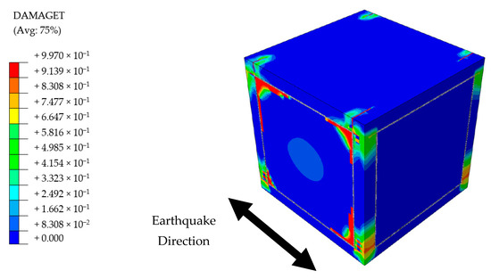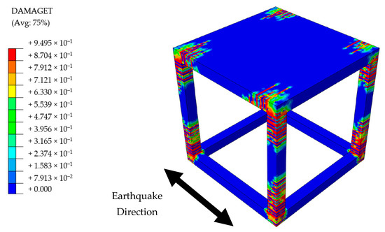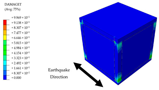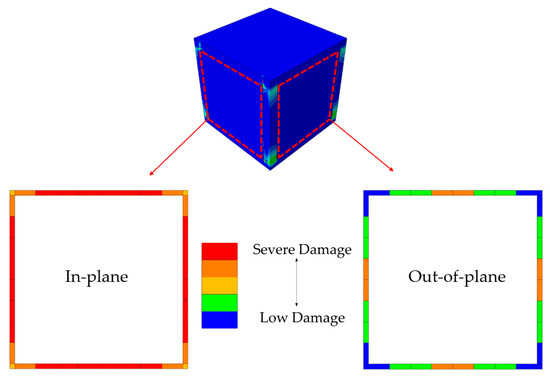 TM building suffered severe damage in the vicinity of mortar joints parallel to the excitation direction, when the seismic loading reached to the peak acceleration of 16.0 m/s2 at the seconds of t: 4.03. Total loss of contact strength was experienced on these parts, hence the infill walls were not able to sustain a complete integrity with the rest of structural system. Therefore, the analysis was stopped at this point and the damages were investigated. Despite no major failure in the infill walls and low-to-moderate damage around the ends of RC column members, see Figure 20, the structural stability was nevertheless damaged due to the frame-to-wall bonding failure. In a real-life example, this situation would progressively lead to out-of-plane failure of the walls, even if a marginal overturning force is the concern. However, the walls that were placed perpendicular to the loading direction could withstand safely, although the middle region of mortar joints started to experience bonding strength decay. A schematic visualization of the contact damages is provided in Figure 21.