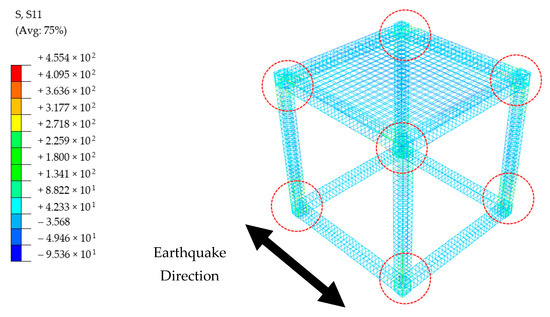 Practically no hazardous situations were spotted for any type of buildings when it comes to the subject of reinforcement bars only. The steel stresses were dominant in the tension region, and at the peak levels, were lower than the yield stress limit, 550 MPa. While it is worth mentioning that the BF building experienced the highest stress values around 450 MPa, both TM and PUFJ types had approximately 250 MPa stress at the maximum. In a similar way to the concrete cracking, aforementioned stresses were also located around the column ends and beam-to-column joints parallel to the loading direction. A representative view belongs to the BF building, and is given in Figure 23.