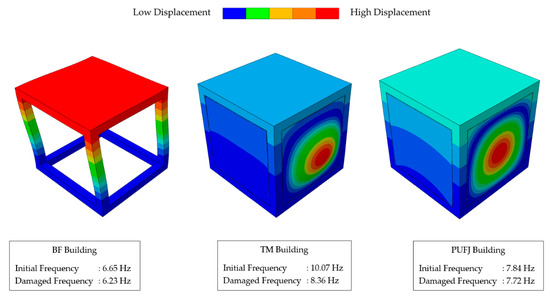Frequency and stiffness change results of the buildings are given in Table 2. As previously mentioned and shown in Figure 18, the results were accumulated in two different stages, namely after the vertical loading (undamaged state) and at the end of earthquake loading (damaged state). BF building exhibited relatively ductile behavior compared to the other types, TM and PUFJ. This is an expected outcome, since the absence of infill walls caused a less stiff system, particularly in horizontal directions. Undamaged frequency of the BF building was measured as 6.65 Hz, whereas some reduction was observed at the end of analysis which led to frequency value at the damaged state as 6.23 Hz, corresponding to 93.7% of the initial state. Similarly, TM and PUFJ types of the buildings also experienced some drop in their natural frequencies at the end of analyses. TM building, thanks to the stiff connection type, had the highest frequency values of 10.07 Hz and 8.36 Hz for the undamaged and damaged states, respectively. As already mentioned in this paper, the analysis was stopped at some point due to the total connection loss of bonding regions between the masonries and RC frames. At the final moment of analysis, ratio between the damaged and undamaged frequency results were calculated as 83.1%. It shows a sharper decrease of frequency in comparison to the BF type. This result shows an interesting fact that, despite more intensive damages were observed in the BF building compared to the TM one, as can be seen in Figure 19 and Figure 20, such bonding failures might cause substantial instabilities on building dynamic characteristics. In this case, the wall detachment led to partial BF like behavior of TM building in the excitation direction, since the walls were not the parts of the structural system anymore. However, the effect of this failure was more severe in terms of the dynamic behavior, as the mass of walls still contributed to the inertia forces. However, frequency results of the PUFJ building were found between the ones of BF and TM types, as 7.84 Hz for the undamaged and 7.72 Hz for the damaged levels. The decrease of frequency value was marginal and calculated as 98.4% of the initial state. In accordance with the frequency results and assuming the undamaged conditions of buildings equal to 100% of their stiffness capacities, the stiffness changes were determined using the Equation (4). In this way, the effect of flexible joint implementation was rather visible, since the stiffness reduction was just slightly more than 3% and calculated as 96.9% of the undamaged state. Whereas the same trend of declination was very distinguishable for BF and TM types, 87.7% and 69.0% of the initial states, respectively. It is worth to mention that the system mass of BF type was approximately 20% less than the other two due to the absence of masonries, therefore the building was exposed to less inertial forces. Having the same amount of mass would potentially result higher level of damages. Furthermore, modal shapes of the buildings were examined and noticed that there was no considerable difference between the undamaged and damaged states for the dominant modes with the highest mass participation ratios. The mode shapes are given for the initial conditions in Figure 24.