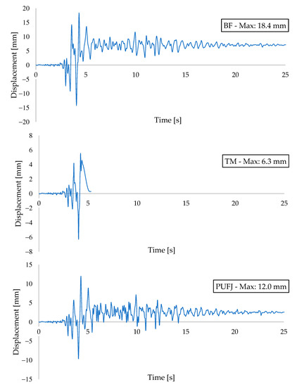 Acceleration and displacement results are presented in Figure 25 and Figure 26, respectively. Top slab vertical coordinates were considered while extracting the acceleration data, whereas the relative difference between the middle points of the top and bottom beams were used to calculate the displacements throughout the earthquake loading. All of the buildings reached the highest acceleration and displacement values when the earthquake intensity approached peak levels, after the time of 4 s from the beginning. BF building experienced the maximum acceleration of 17.5 m/s2 at t: 4.32 s. Similarly, TM and PUFJ had the acceleration values as 16.0 m/s2 and 18.4 m/s2 at the times of t: 4.03 and t: 4.28 s, respectively.