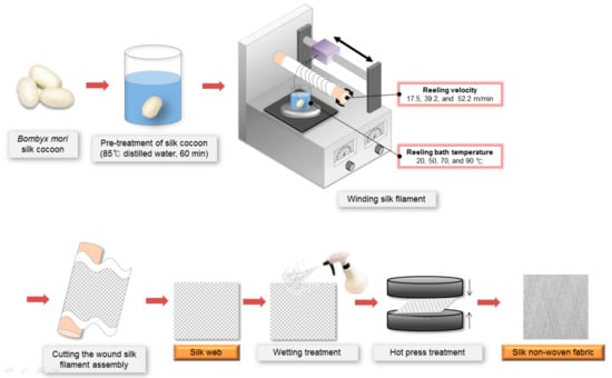 - Lee, J.H.; Bae, Y.S.; Kim, S.J.; Song, D.W.; Park, Y.H.; Bae, D.G.; Choi, J.H.; Um, I.C. Preparation of new natural silk non-woven fabrics by using adhesion characteristics of sericin and their characterization. Int. J. Biol. Macromol. 2018, 106, 39–47. [Google Scholar] [CrossRef] [PubMed]