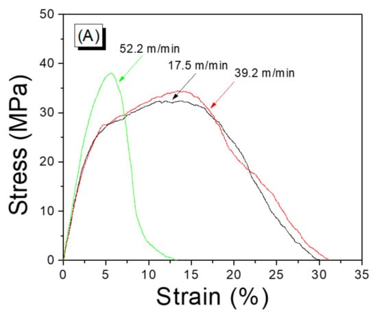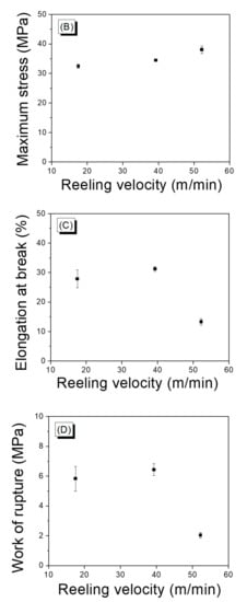 The mechanical properties of a silk web are vital for cosmetic and biomedical applications. Therefore, in this work, these properties are measured as a function of the reeling velocity (see Figure 3). As shown in the stress–train (S–S) curve (Figure 3A), the web obtained at a reeling velocity of 17.5 m/min exhibited ductile behavior characterized by a high elongation at break (30%). The S–S curve of the web remained almost unchanged until a velocity of 39.2 m/min was reached. However, a further increase in the reeling velocity (52.2 m/min) resulted in a behavior of brittle material characterized by a significant decrease in the elongation at break (13%). The maximum stress of the silk web increased slightly with increasing reeling velocity (Figure 3B). The elongation at break and work of rupture changed only modestly up to velocities of 39.2 m/min and decreased significantly at 52.2 m/min (Figure 3C,D).