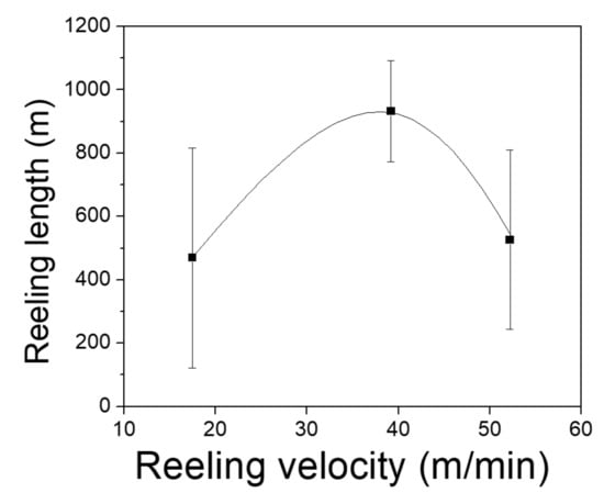 Figure 5 shows the reeling length of the silk filament as a function of the reeling velocity. As the figure shows, the mean reeling length (469 m) of the filament at a reeling velocity of 17.5 m/min increased to 933 m at 39.2 m/min and then decreased to 527 m at 52.2 m/min. This indicated that the reel-ability of the silk filament from the cocoon in the electric winder system was associated with an optimum reeling velocity (39.2 m/min in this study). The mean length of silk filaments that could be extracted from the silk cocoons used in this study was 1007 m. Therefore, the mean reeling length (933 m) at 39.2 m/min indicated that 93% of the silk filaments could be reeled and extracted from the silk cocoon until the first breakage occurred. That is, the silk filament in the cocoon could be efficiently utilized in the fabrication of a silk web by using the optimum reeling velocity (39.2 m/min).