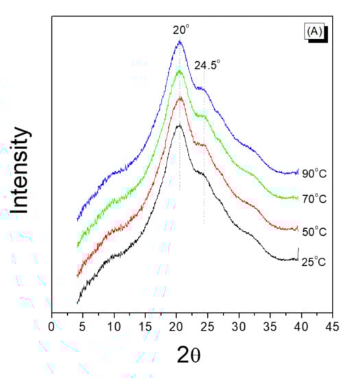 Figure 7A shows the XRD results of the silk web obtained at different reeling bath temperatures. A crystalline peak at 20° and a shoulder at 24.5° (attributable to β-sheet crystallites) occurred in each case [,,,,]. As the bath temperature was increased to 50 °C, the shoulder at 24.5° became slightly more pronounced than at lower temperatures and remained unchanged thereafter. Kim et al. reported that the shoulder at 24.5° in degummed silk became more evident with increasing amounts of degumming agent and the degumming ratio. In addition, the crystallinity index calculated from FTIR spectra reconfirmed the increase of crystallinity of degummed silk by increasing the degummed ratio []. Therefore, it can be said that this more evident shoulder at 24.5° in Figure 7A is indicative of an increase in β-sheet crystallite formation.
