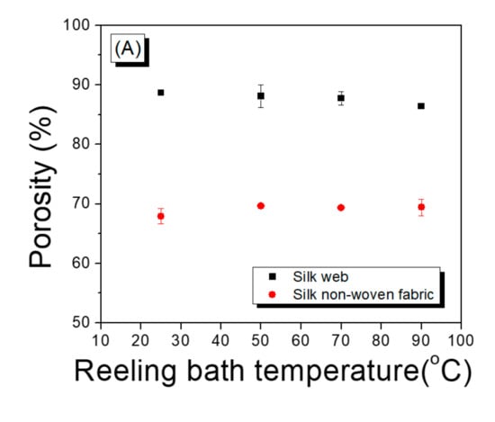The hot press treatment led to considerable changes in the porosity and mechanical properties of the silk web. The reeling bath temperature has a significant effect on the reel-ability of the silk filament from the cocoon, and the lowest temperature for good reel-ability was 50 °C. The effect of the bath temperature on the structure and properties of the silk porous materials varied with the form (i.e., web or non-woven fabric) of the material. In the case of the silk web, as the reeling bath temperature was increased, the β-sheet crystallites were slightly more formed, whereas the porosity and swelling ratio decreased slightly. However, the structure and properties of the silk non-woven fabric remained unchanged with changes in the bath temperature.