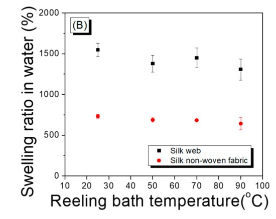 Figure 8 shows the porosity and swelling ratio (in water) of the silk web and silk non-woven fabrics. Regardless of the reeling bath temperature, the silk non-woven fabrics were characterized by lower porosities and swelling ratios than the silk webs, owing to the compression effect induced by the hot press treatment. That is, when the silk web underwent hot pressing, the compactness of the morphological structure increased and the space (pore) between the silk filaments decreased, leading to a reduction in the porosity. The porous material could hold water in the void space (i.e., pores). Therefore, the lower swelling ratio of the silk non-woven fabric (compared with that of the web) was attributed to a decrease in the porosity of the non-woven fabric, owing to the hot press treatment. This result was quite consistent with the good correlation between the porosity and swelling ratio of a silk porous material considered in a previous study [].