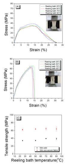 Representative stress–strain curves of the ((A) silk web and (B) silk non-woven fabric), (C) tensile strength, and (D) elongation at break of the silk web and silk non-woven fabrics prepared at various reeling bath temperatures. The reeling velocity was 39.2 m/min.