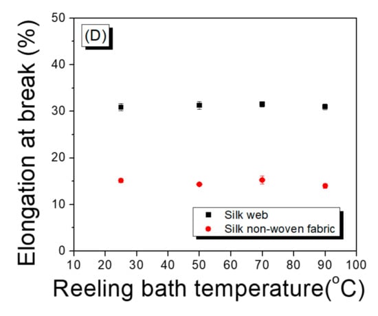 In Figure 9C,D, the tensile strength (the highest stress) and elongation at break of the silk web and silk non-woven fabric are plotted as a function of the reeling temperature. The tensile strength and elongation of the fabrics were higher and lower, respectively, than those of the webs. When silk filaments were reeled from the silkworm cocoon and wound on the roll collector, the swollen sericin of the filament in the reeling bath helped to bind the filaments together. This allowed the formation of a silk web with desirable mechanical properties. When the web was hot pressed, the sericin was deformed, thereby strengthening the bonds between neighboring silk filaments [,]. The higher strength and lower elongation of the silk non-woven fabric (compared with those of the silk web) resulted mainly from the increased sericin binding effect induced by the hot press treatment.