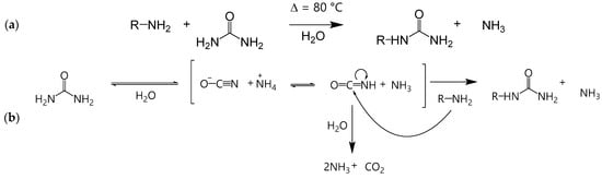 In the past (1800s to 1940s), the transamidation of urea with amines was the default process for substituted ureas and polyurea industrial production [48,49]. The reaction was typically carried out at high processing temperatures (>120 °C) by reacting high-molecular-weight diamines or alkanolamines with urea in bulk or in solution [50,51,52,53,54,55]. These high-temperature processes are still used in industry for making products such as phenylureas [3,4,56,57,58,59,60,61] used as herbicides and coatings [61,62,63], polyalkylenureas used for melamine-formaldehyde modification [64] and cycloalkyleneureas produced from 1,2-ethylenediamine or 1,3-propylenediamine and used for easy-care cellulose-containing textiles [64,65]. Recently, ureido functionalization of chitosan, in a low-temperature aqueous process, has enabled the synthesis of high-quality chitosan aerogels [47,66]. The ureido-functionalized chitosan aerogels could even be produced by ambient pressure drying, with outstanding mechanical properties, an exceptional feat in the field of biopolymer aerogels [47].