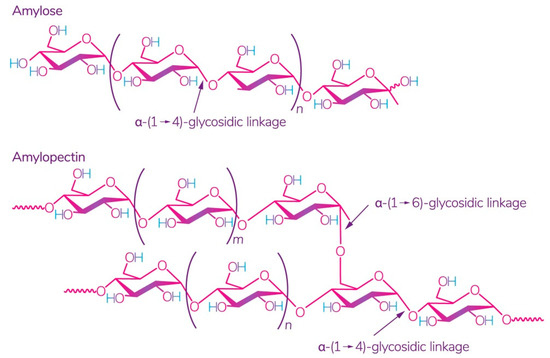 Structure of amylose and amylopectin [30]. Reproduced from Kadokawa, Polymers; published by MDPI, Basel, Switzerland, 2012.