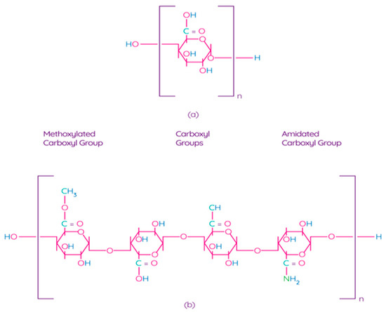 Pectin is one of the main components of the plant cell wall, contributing to the integrity and rigidity of tissues, and is considered one of the most complex macromolecules in nature [69]. Although pectin is ubiquitous in the plant kingdom, pectin derived from apples, citrus fruits, sunflowers, and sugar beets is an undisputed commercial source for the processing industry due to their physical and chemical properties and the availability of biomass [70]. Pectin is a poly–α–1–4–galacturonic acid (Figure 4a) with different degrees of methylation of carboxylic acid residues and/or amidated polygalacturonic acids (Figure 4b) [71]. Carboxyl groups of galacturonic acid are esterificated with methanol, resulting in methoxylated carboxyl groups. On the other hand, amidated carboxyl groups are obtained when galacturonic acid is converted with ammonia to carboxylic acid amide.