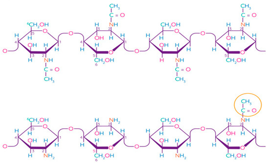 Chitosan is a linear polysaccharide consisting of randomly linked units of β-(1,4)-D-glucosamine and N-acetyl-D-glucosamine (Figure 5). Chitin is the second most common structural polysaccharide found in nature after cellulose and is usually deacetylated by an alkali for chitosan production [79,80]. Natively, chitin is presented in the form of ordered crystalline microfibrils that form structural components in the exoskeleton of arthropods or in the cell walls of fungi and yeast. So far, the main commercial sources of chitin are the shells of crabs and shrimps [81]. In industrial processing, chitin is extracted by acid treatment to dissolve calcium carbonate, and then by an alkaline solution to dissolve proteins. In addition, a discoloration stage is often added to remove the pigments and obtain a colorless pure chitin [82]. Chitin is usually isolated from the exoskeleton of crustaceans and, in particular, from shrimps and crabs, where α-chitin is produced [83]. Squid is another important source of chitin, in which it exists in the β-form, which has been found to be more amenable to deacetylation. Such chitin also shows higher solubility, reactivity, and affinity for solvents and swelling than α-chitin due to the much weaker intermolecular hydrogen bond attributed to the parallel arrangement of the main chains [83]. Some types of insects, fungi, bacteria, and algae can also be alternative sources of chitin/chitosan [84,85,86].