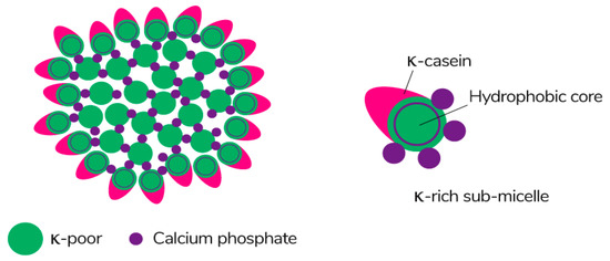 Caseins are suitable hydrocolloids for the formation of edible films among proteins due to their high nutritional value, solubility in water, and ability to emulsify. Casein is the main protein extracted from milk (~80%) [113], consisting of four different protein fractions: αS1-, αS2-, β-, and κ-casein [114], which together form colloidal micelles in milk (Figure 7) stabilized by casein structures and calcium-phosphate bridges [115]. The unique properties of the four protein fractions affect the film-forming ability of casein [116].