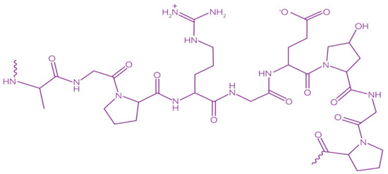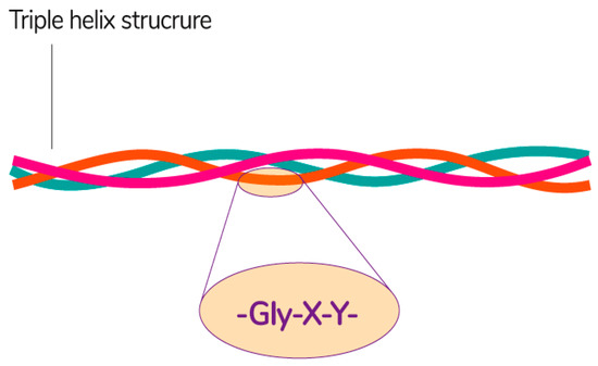 Collagen consists of three parallel chains of α-helices twisted in the form of a right triple helix [129] and constructed from frequently repeated fragments with a characteristic sequence -Gly-X-Y- (Figure 8). Glycine is every third amino acid residue, proline is often found in the X position, and the Y position can be occupied by both proline and 4-hydroxyproline. In addition, the collagen molecule contains residues of 3-hydroxyproline and 5-hydroxylysine. The right triple helix self-associates to form highly ordered cross-linked fibrils [129]. These fibrils form insoluble fibers that provide an extracellular matrix with high integrity and mechanical tensile strength due to its tightly wound triple helical structure. Collagen molecules are divided into 26 different types, which are grouped into 8 families, depending on its structure, chain bonding, and position in the organism. These families include fibril-forming, basement membrane, anchoring fibrils, microfibrillar, hexagonal network-forming, transmembrane, multiplexins and fibril-associated collagens with interrupted triple helix [134].