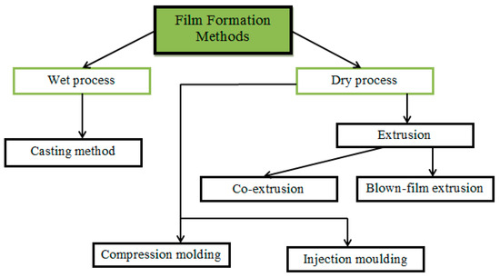 Edible food films are usually made in two ways: wet and dry processes, using the appropriate methods (Figure 10) [174].