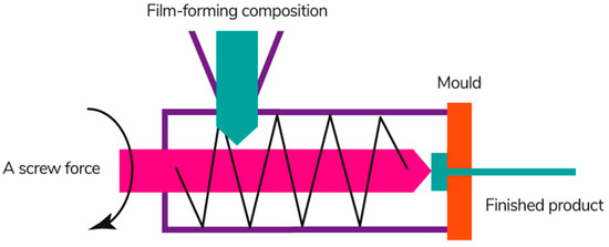 Extrusion is a continuous technological process of obtaining a film material by pushing the molten film-forming composition through a forming hole of a certain shape (Figure 12) [200]. This process involves several operations simultaneously: melting, mixing, dosing, and forming [201].