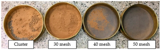 The SOC in this study was supplied by a local oil mill (Sinsonsuccbulgin, Seoul, Korea). SOC collected and used 90% of China’s sesame seeds and 10% of South Korea’s sesame seeds within 2 weeks of heat compression. The SOC was dried for 24 h in an oven at a temperature of 90 °C to remove residual moisture before being used as biomass. The dried SOC was processed in powder form using a grinder (HMF-3160S, Hanilelec, Seoul, Korea). The crushed SOC powders were classified by particle size to reproduce constant properties and increase the reliability of the experiment. At this time, the sieve test machine used a self-made product. The machine consisted of seven test sieves (210(Φ) × 60(h), Chunggye Sieve Inc., Seoul, Korea). The powder was classified by particle size through left and right repetitive motions. SOC powder (100 g) was classified according to particle size (Figure 1). With 120 cycles per minute, it lasted 5 min, and on classification, the cluster SOC powder accounted for 32.31%, 30-mesh SOC powder accounted for 64.16%, and 40-mesh SOC powder accounted for only 3.53% (Table 1). In this study, 30 and 40 mesh SOC powder were used, corresponding to a particle size of 600–425 μm and 425–300 μm, respectively.