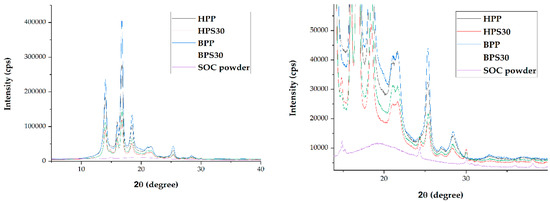 XRD analysis of the SOC powder and PP/SOC specimens was performed. The crystal peak of PP is found between 10° and 30°, consisting mainly of alpha and beta crystals. There are a total of four crystal peaks of PP that stand out from the XRD results of this experiment. These include peaks of 14.02°, 15.98°, 16.78°, and 18.46°. According to a precedent study, each of these is α(110), β(300), α(040), and α (130) crystal [29]. Owing to the addition of SOC, these PP crystal peak intensities were reduced. Also, five crystal peaks were observed due to SOC (Figure 3). This corresponded to 14.88°, 24.44°, 30°, 35.97°, and 38.15°, respectively, compared to the XRD results for SOC powder. Owing to the addition of SOC, both specimens demonstrated reduced crystallinity. HPS30 showed a 7% decrease in crystallization compared to HPP, and BPS30 showed a 14% decrease in crystallization compared to BPP. This may be attributed to the large amount of amorphous materials in the SOC. The SOC powder exhibited a crystallinity of 29.11%, which is significantly low compared to that of neat PP (Table 5). SOC was also observed to inhibit the crystallization of PP. Previous studies have demonstrated that the high-volume addition of biomass reduces crystallinity by inhibiting the movement of the polymer chain [30].
