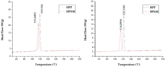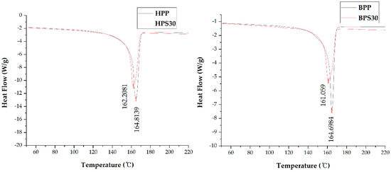 DSC analysis of PP/SOC specimens was performed. An exothermic transition by crystallization occurred in the cooling curve, where the peak was shifted to a lower temperature by the addition of SOC (Figure 4). The peak temperature corresponds to the crystallization temperature (Tc). The HPS30 showed a 3.1% reduction in Tc compared to the HPP, and the BPS30 showed a 6.6% decrease in crystallization temperature compared to the BPP. The reduction in Tc confirms that SOC acts as an inhibitor that inhibits the crystallization of PP. As a result of evaluating the heating curve of DSC, an endothermic transition by melting occurred, where the peak was shifted to a lower temperature by the addition of SOC (Figure 5). The peak temperature corresponds to the Tm. Due to the addition of SOC, HPS30 was found to have reduced melting point by 1.6% compared to HPP and BPS30 by 2.2% compared to BPP.