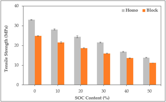 The tensile strength tended to decrease as the SOC content increased (Figure 6). This trend appeared in all the specimens. HPS50’s tensile strength was reduced by 58% compared to HPP, and BPS50 was reduced by 55.1% compared to BPP. This trend appears to be mainly due to the occurrence of irregular voids caused by moisture in the SOC and the phase separation between PP and SOC. SOC contains a large amount of hydrophilic material, which makes it almost impossible to completely remove moisture from the material; it also has a low interfacial adhesion with the hydrophobic PP [14,31,32].