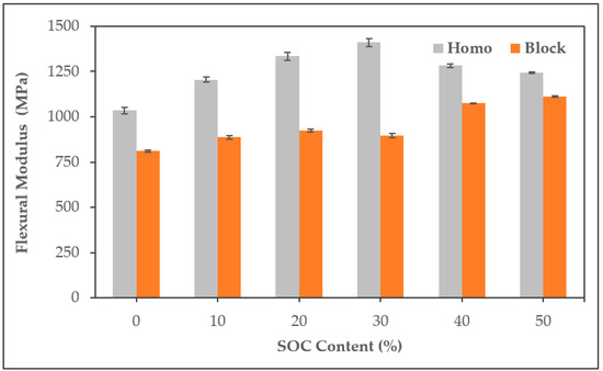 PP/SOC showed improved flexural modulus compared to neat PP for all conditions. (Figure 7). Both HPS and BPS showed an improvement in modulus of up to 36.4% and 37.3%, respectively. This tends to be the opposite of the results of tensile strength and are due to the different effects of defects in materials on bending and tensile tests. In bending tests, strength is more affected by reinforcements such as fibers than weak parts such as voids [33]. Thus, the SOC appears to act as a reinforcement, resulting in the improvement of the flexural modulus under all conditions.