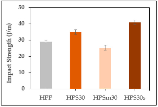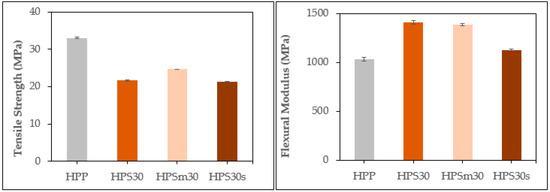 Mechanical properties of HPS30s were identified. Tensile strength was very similar to HPS30, but showed significant differences in flexural modulus and impact strength. Tensile strength decreased by1.6% but, flexural modulus was reduced by 20% compared to the HPS30. The impact strength increased by 16.8% compared to the HPS30. As the particle size of filler decreases, dramatic impact strength improvement has been shown, and this trend has also been confirmed by precedent studies [35,36,37].