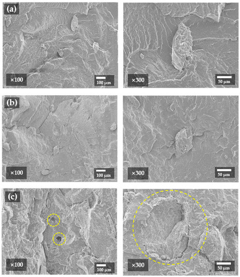 A cross-section of the specimens with an SOC content of 10–30 wt% was observed. SOC particles in the cross-section appeared to be unstructured, and 100 μm particles smaller than 30-mesh particles were observed (Figure 10b). The SOC particles seem to have been further crushed through the extrusion and injection molding processes. Defects such as voids and phase separation were observed, which increased with increasing SOC content. The SOC content of the 30% specimen indicated that these defects were maximized (Figure 10c).