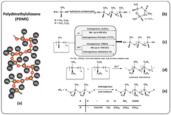 A free polydimethylsiloxane chain fragment as a representative structural motif for silicones (a) and main pathways approached for obtaining oligo- or polydiorganosiloxanes: hydrolysis-condensation of dialkoxysilanes (b); ring-opening polymerization of cyclosiloxanes (c); ring-opening copolymerization of diorganocyclosiloxane mixtures (d); diorganocyclosiloxane equilibration with 1,3-bis(functionalized)disiloxanes (e).
