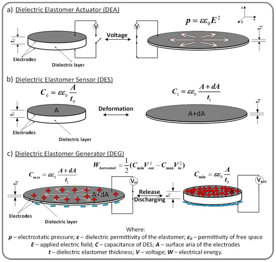 Dielectric elastomers (DEs) are a class of electroactive polymers (EAPs) widely used as active elements in soft transducers (actuators, sensors and generators) [57]. Such a transducer consists in principle of a highly deformable dielectric elastomer film sandwiched between compliant electrodes. When a voltage is applied to the electrodes, the electrostatic force squeezes the dielectric elastomer film expanding it laterally due to the elastomer incompressibility (dielectric elastomer actuator, Figure 3a) [58]. Two mechanisms underlie the electrical action, Maxwell stress (caused by coulombian interaction between oppositely charged electrodes) and electrostriction (based on small displacements of dipoles from their equilibrium positions under an applied electric field [59]. However, although it occurs in all dielectrics, in the case of dielectric elastomers, the electrostriction contribution is low, often being ignored, especially in the case of non-polar polymers such as silicones [60].