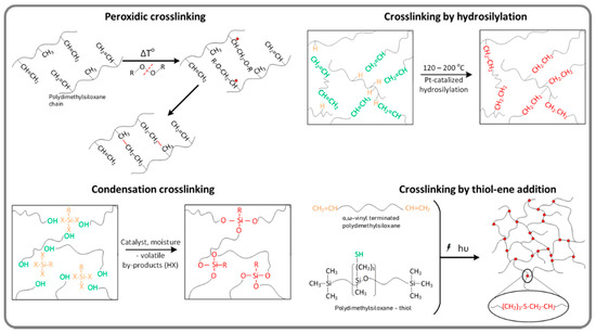 Based on the above and due to their appropriate mechanical properties (low modulus and high elongation), silicones are among the most used polymers in DETs. Their properties can be easily tuned by the preparation strategy: proper choice of the molecular mass and microstructure of the polymer matrix; adding of more or less active fillers, whether these are incorporated in the polymeric matrix (ex situ) or generated in situ; crosslinking mode (through the side or ending functional groups) or mechanism (condensation, radicalic or by hydrosilylation). Thus, it was possible to improve the performance of silicone elastomers by manipulating parameters, such as the molecular weight of the polymer and the crosslinking pattern, without other additions or chemical changes. Polydimethylsiloxanes with molecular weights from several tens of thousands to over one million Da have been obtained [41]. They were crosslinked by different chemical pathways: peroxide, condensation, hydrosilylation, dehydrocoupling and thiol-ene addition (Figure 4) [53] obtaining soft to ultra-soft silicones, with Young’s moduli generally less than 0.1 MPa and elongation at break of over 1000%, and good values for elastic recovery and stress decay [41].