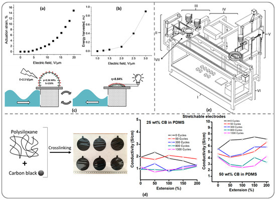 By properly designing polysiloxanes in terms of structure, molecular weight and crosslinking pattern, it was found that a silicone elastomer based on PDMS (Mw = 80,000 Da) containing 8.4 mol.% vinyl groups crosslinked by thiol-ene addition with a PDMS (Mw = 35,000 Da) containing 16.5 mol.% SH group along the chain, without other additions, incorporated in a DEA developed a lateral actuation of 15% when applying an electric field E = 20 MV/m (Figure 5a) [53]. A DEG built from three circular layers of common silicone with a diameter of 120 mm and coaxial circular stretchable electrodes of 60 mm diameter also based on silicone but embedding 25 wt.% carbon black was able, at 200% strain, to harvest almost 1 mJ (Figure 5b) [79]. An energy harvesting efficiency of η = 8.84% was achieved with a DEG based on silicone filled with 2 wt.% TiO2 nanotubes and carbon black electrodes (Figure 5c) [80]. By incorporating carbon black [81] or carbon nanotubes within the PDMS matrix, stretchable electrodes were obtained, several conductivity performances of these being showed in Figure 5d.