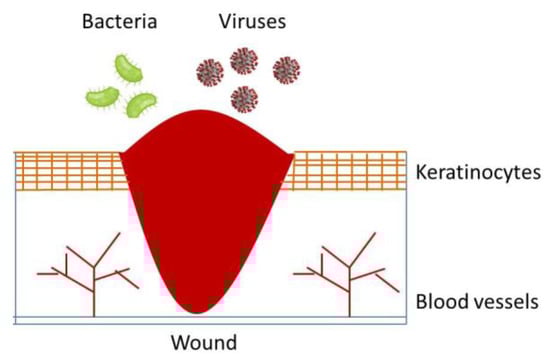 Wounds could be defined as a skin discontinuity or break due to a mechanical, thermal or physical damage caused by an external event [1]. According to the literature and to the daily medical experience, wounds can be generated by the effects of accidental or inferred contact with blades [2], fire burns [3] and gunshot [4]. These events are passively suffered by the target organs; in other situations, they can be induced by surgical operations, under controlled area and conditions such as anesthesia [5]. The normal anatomic structure of skin is characterized by a continuous tissue that functions to protect human beings from external agents in order to preserve the integrity of the organs and tissues. According to this definition, a wound can be intended as a disruption of this continuous skin-tissue structure (see Figure 1, where a section of a wounded skin is qualitatively represented).