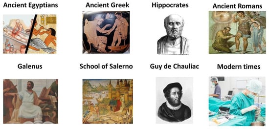 Main physicians and milestones of medicine for wound treatment from ancient to modern times (sources: www.wikipedia.com, www.youtube.com, accessed on 10 April 2021).