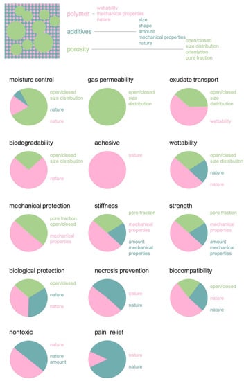 The foam structural features described above determine the properties at different extents. For example, the morphology of the pores has a profound effect on permeability or on exudate transport, and to a lesser effect on the mechanical properties, where, instead, foam density has a major role. Figure 4 describes these dependencies.