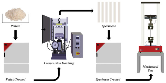 The specimens for the rheological and mechanical characterization were prepared by compression molding in a Carver (Carver, Wabash, IN, USA) laboratory hydraulic press at the temperature of 180 °C under a mold pressure of 300 psi and for about 3 min. Before compression molding, the pellets were subjected to three different pretreatments in the environmental conditions reported in Table 1.