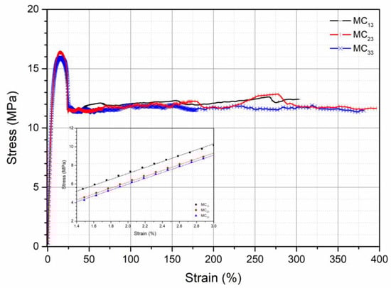Stress–strain curves obtained from the tensile tests of all the specimens are reported in Figure 2, Figure 3 and Figure 4.