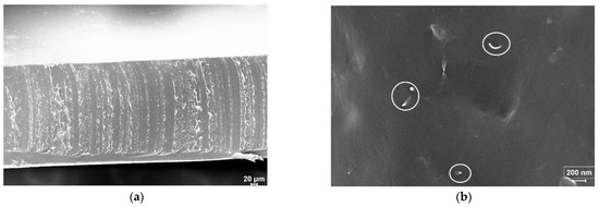SEM analysis of the polyurea-polyurethane-MWCNTs nanocomposite films: (a) in cross-section; (b) from the top.