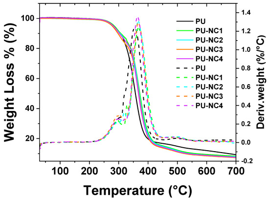 According to the TGA analysis, it appears that the introduction of carbon nanotubes into polyurea films had a slightly positive effect on thermal resistance, as their degradation process began later compared to the control sample (PU). However, as the concentration of carbon nanotubes increased, this effect decreased. The temperature corresponding to the maximum decomposition rate was also higher in the case of nanocomposites. Starting at 354 °C (in the case of PU samples) and at 366 °C, respectively (in the case of the nanocomposite samples), a significant weight loss process could be observed due to the decomposition process of the polymeric matrix (Figure 5).